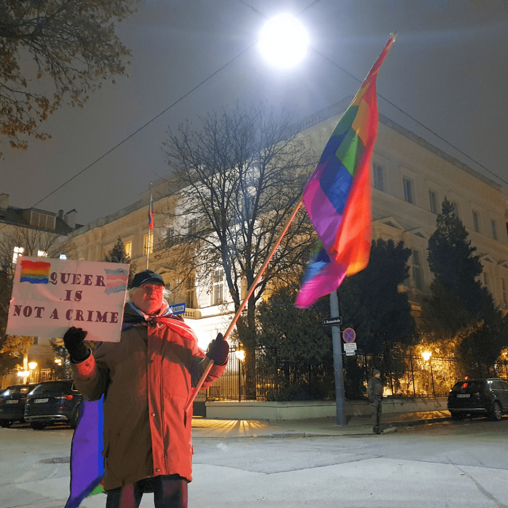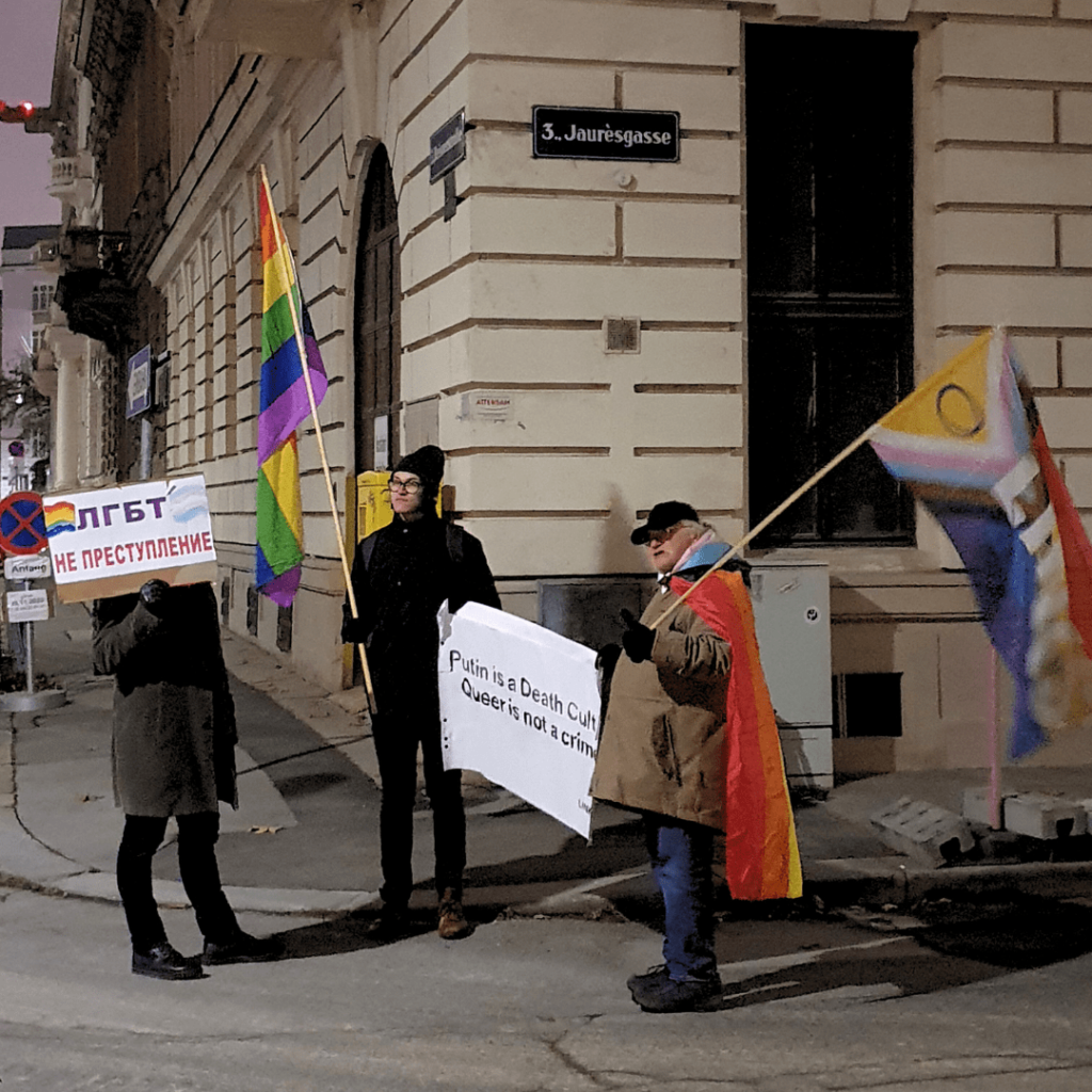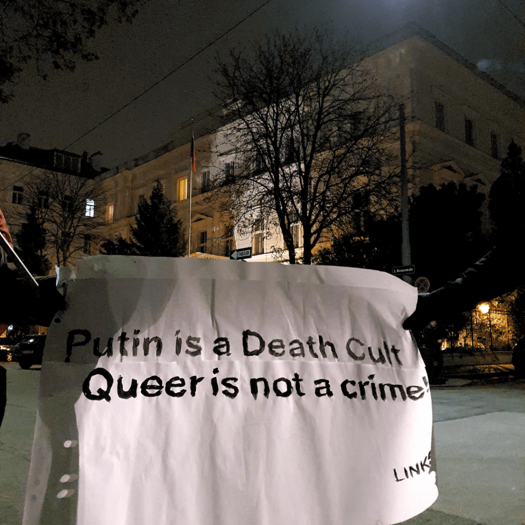 Wir lassen uns nicht einschüchtern, und wir lassen uns nicht spalten! Am Tag des Skandalurteils waren LINKS-Aktivist*innen vor der russischen Botschaft in Wien auf der Straße. Wir haben unsere Solidarität ausgedrückt und gezeigt: You can never stop us from being out, loud and proud!
