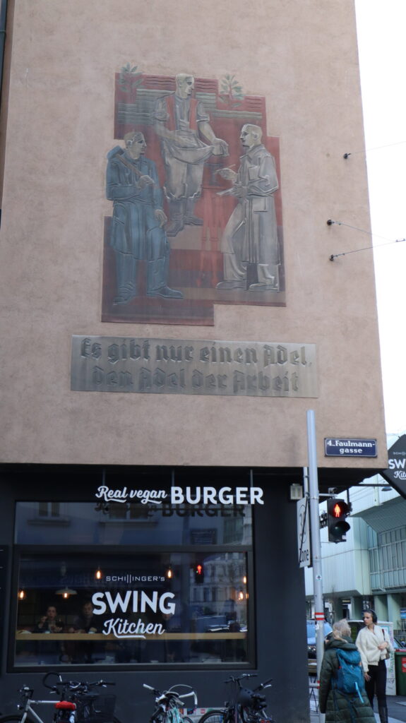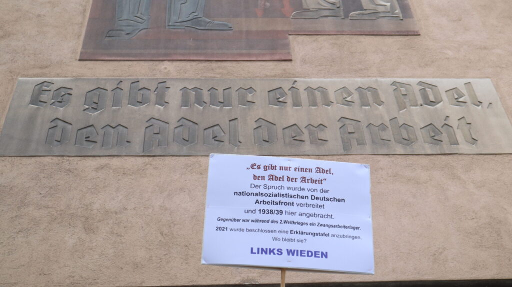 Leider ist davon eher wenig in Wien zu sehen, das Wiener Stadtbild zeigt viel unkontextualisierten Nationalsozialismus und stellt Antisemiten und dessen Zitate uneingeschränkt zur Schau. Straßennamen, Denkmäler und auf der Wieden sogar ein Wandbild nehmen direkt Bezug auf die Diktatur. Unsere LINKS-Bezirksrätin Amela Pokorski setzt sich seit Jahren dafür ein, dass ein Motto der „Deutschen Arbeitsfront“ an einer Häuserwand im vierten Bezirk kontextualisiert wird: